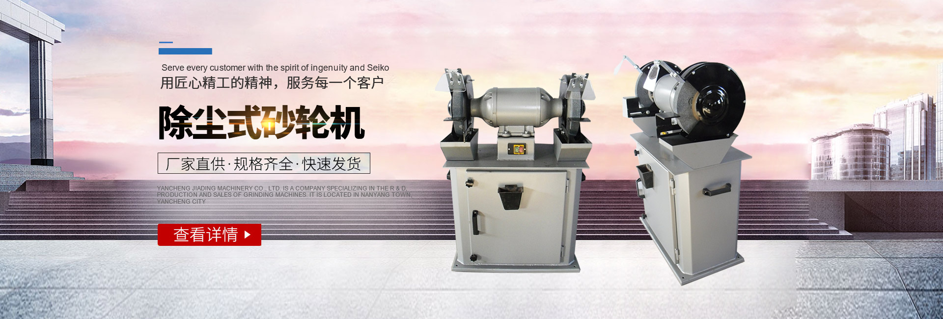 鹽城嘉鼎機(jī)械有限公司是一家專(zhuān)業(yè)從事砂輪機(jī)研發(fā)、生產(chǎn)、銷(xiāo)售為一體的公司,坐落在鹽城市南洋鎮(zhèn)。主要產(chǎn)品有:砂輪機(jī)、砂帶機(jī)等系列。其中砂輪機(jī)有:臺(tái)式、立式、懸掛式、除塵式、它驅(qū)式、防爆式等三十多個(gè)規(guī)格品種,也可定制特殊行業(yè)所需的異型砂輪機(jī)。